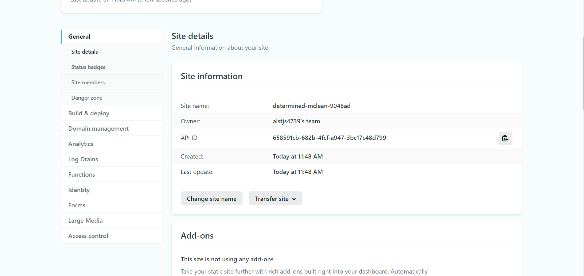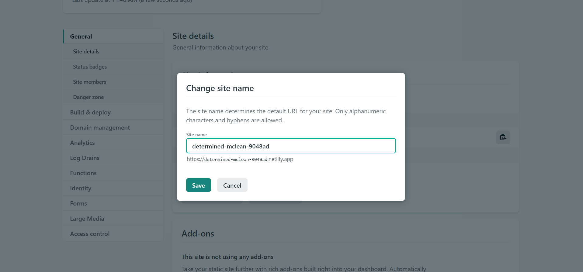 그리고 Change site name버튼을 클릭하고 웹사이트 주소를 원하는 대로 바꿔준다.