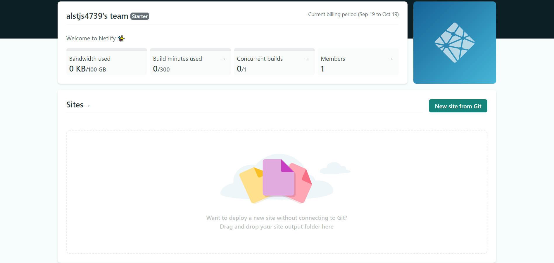 로그인을 하면 다음과 같은 화면이 보인다. 이때 미리 만들어 둔 코드가 담긴 폴더를 Sites 부분에 드롭해준다.