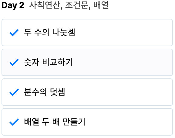 | [코딩테스트 입문] Python 1일차 (두 수의 합, 두 수의 차, 두 수의 곱, 몫 구하기) (1) | 2024.01.06 |