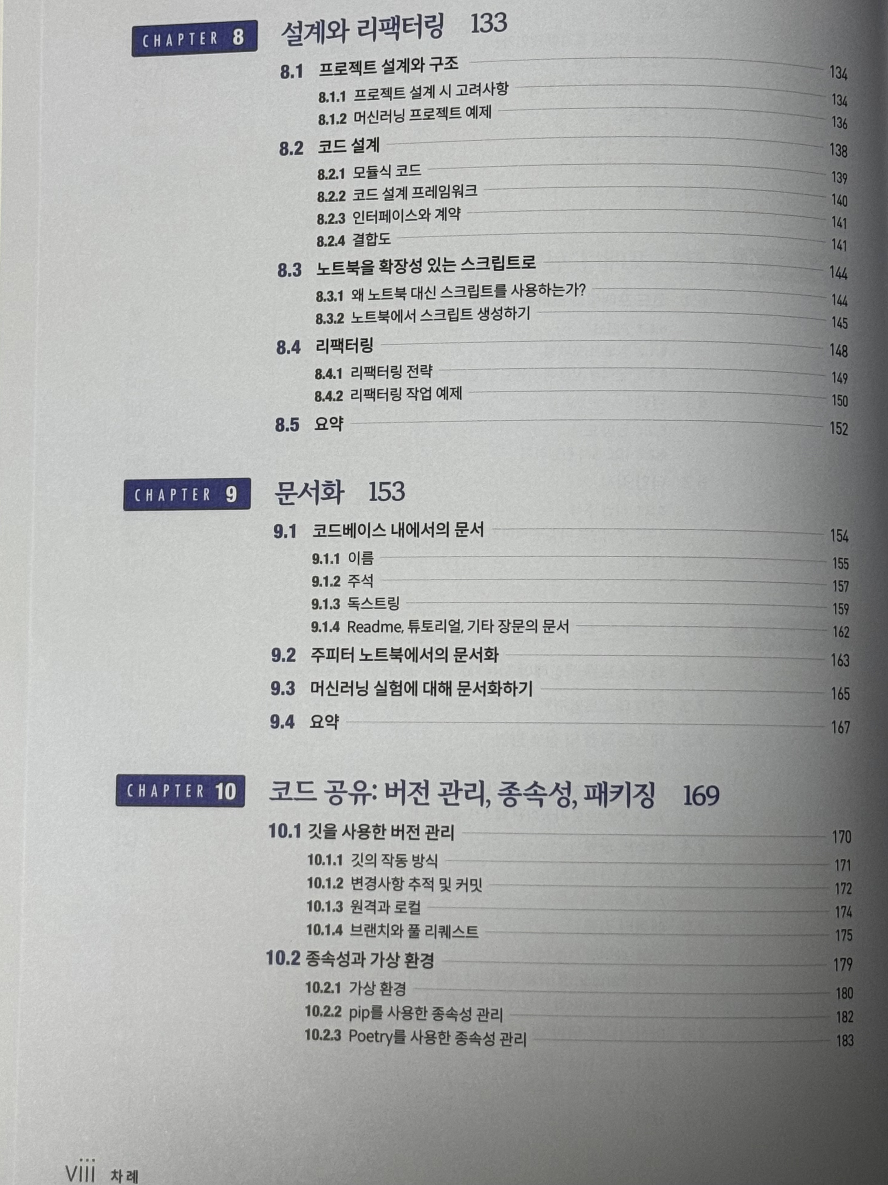 데이터 과학 코드에 적용할 수 있는 실무적인 팁을 구체적인 설명과 코드 예시를 통해 제시하고 있기 때문에, 이론 학습뿐만 아니라 실제 프로젝트에서 직접 활용하는 데 큰 도움이 될 것 같다. 특히 9장의 '주피터 노트북에서의 문서화', '머신러닝 실험에 대해 문서화하기' 부분의 내용은 실제 프로젝트 진행과정에서 팀원들과 함께 고민하던 내용이었어서 인상 깊었다.