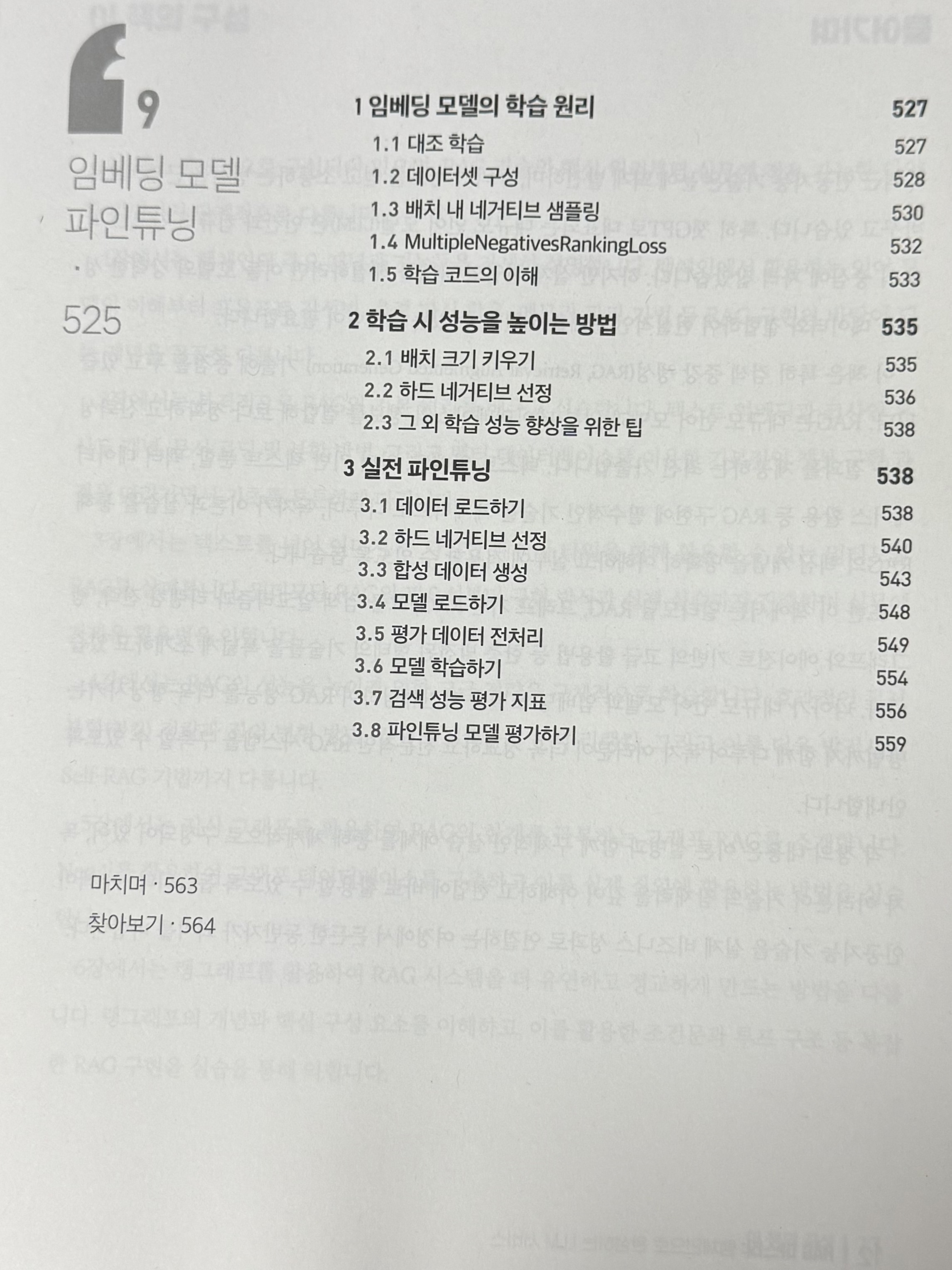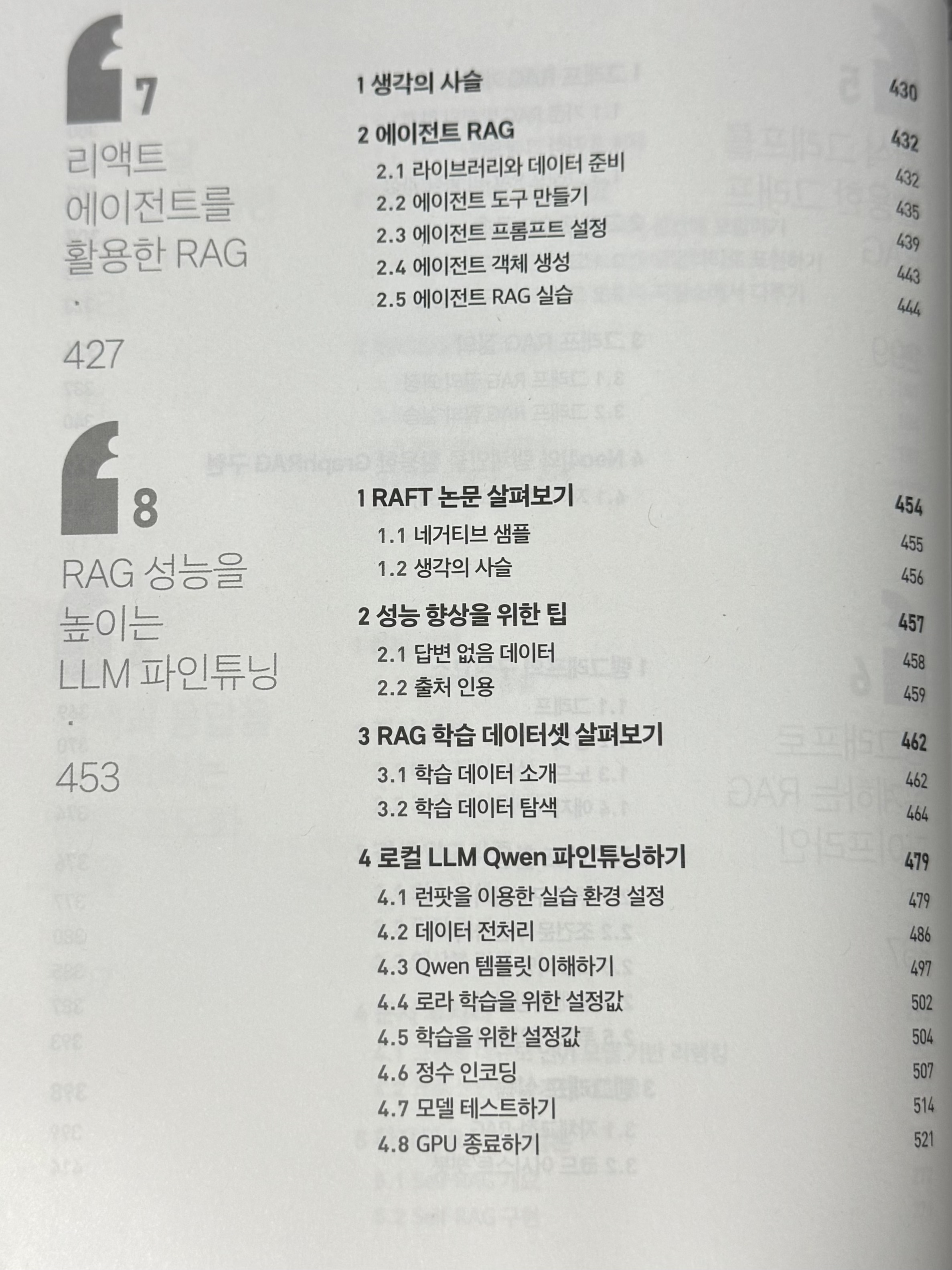 다른 개발 도서들을 보면 단순히 기술에 대한 설명과 실습에 대한 설명을 포함한 경우가 많았다. 하지만 이 책은 다르다. 현업에서 RAG 기술을 다뤄본 개발자 분들이 집필하신 책이기 때문에 저자분들의 실제 경험에서 얻어진 RAG 구현 노하우를 바탕으로 구성된 내용이 곳곳에서 보인다. 특히 Chapter 8 RAG 성능을 높이는 LLM 파인튜닝, Chapter 9 임베딩 모델 파인튜닝 파트에서 단순한 설명을 넘어 성능 향상에 직접적으로 기여할 수 있는 튜닝 전략과 실전 팁들이 구체적으로 제시되어 있어 이론뿐만 아니라 실무에서도 바로 적용해 볼 수 있는 인사이트가 가득하다는 생각이 들었다.