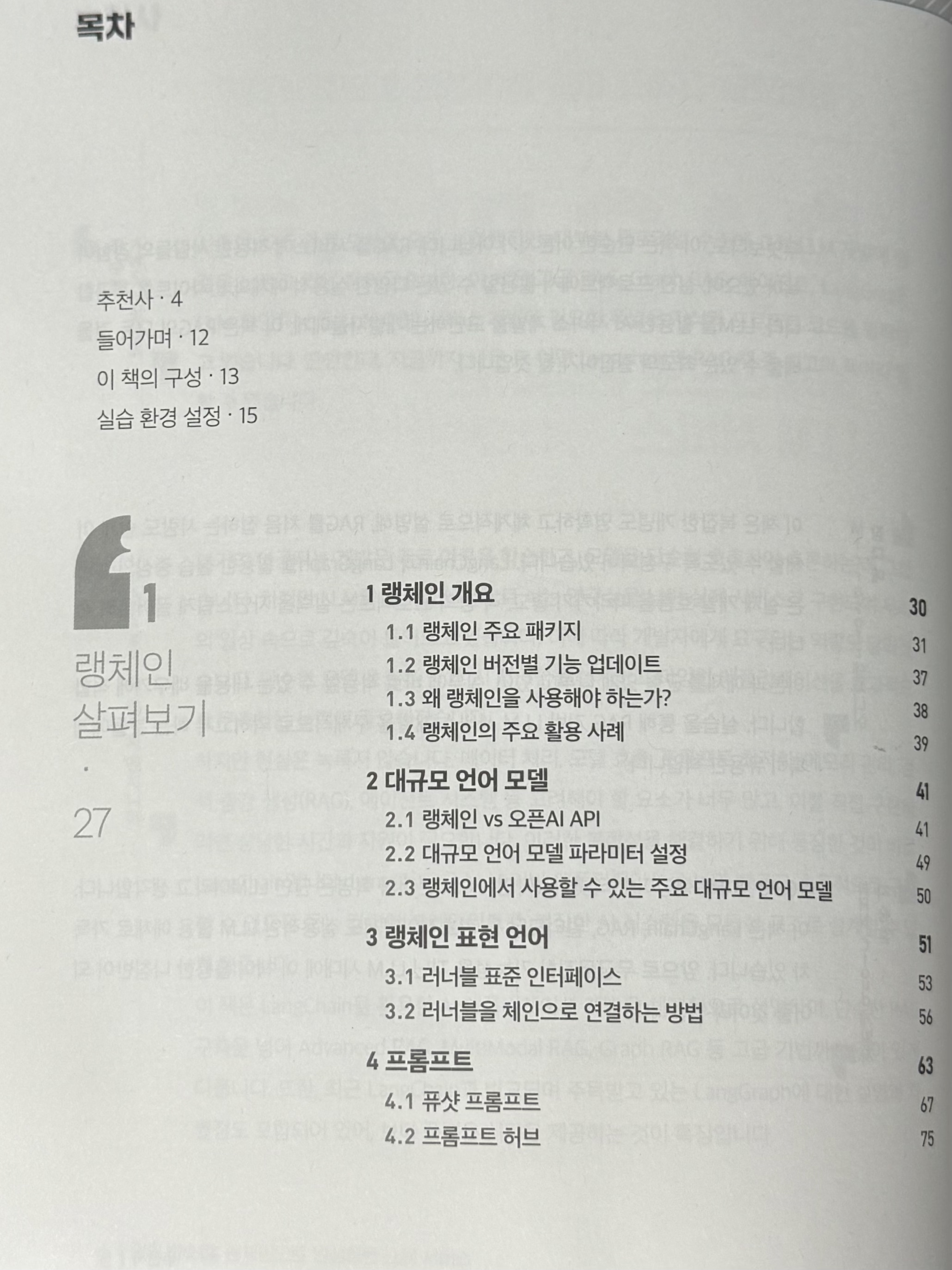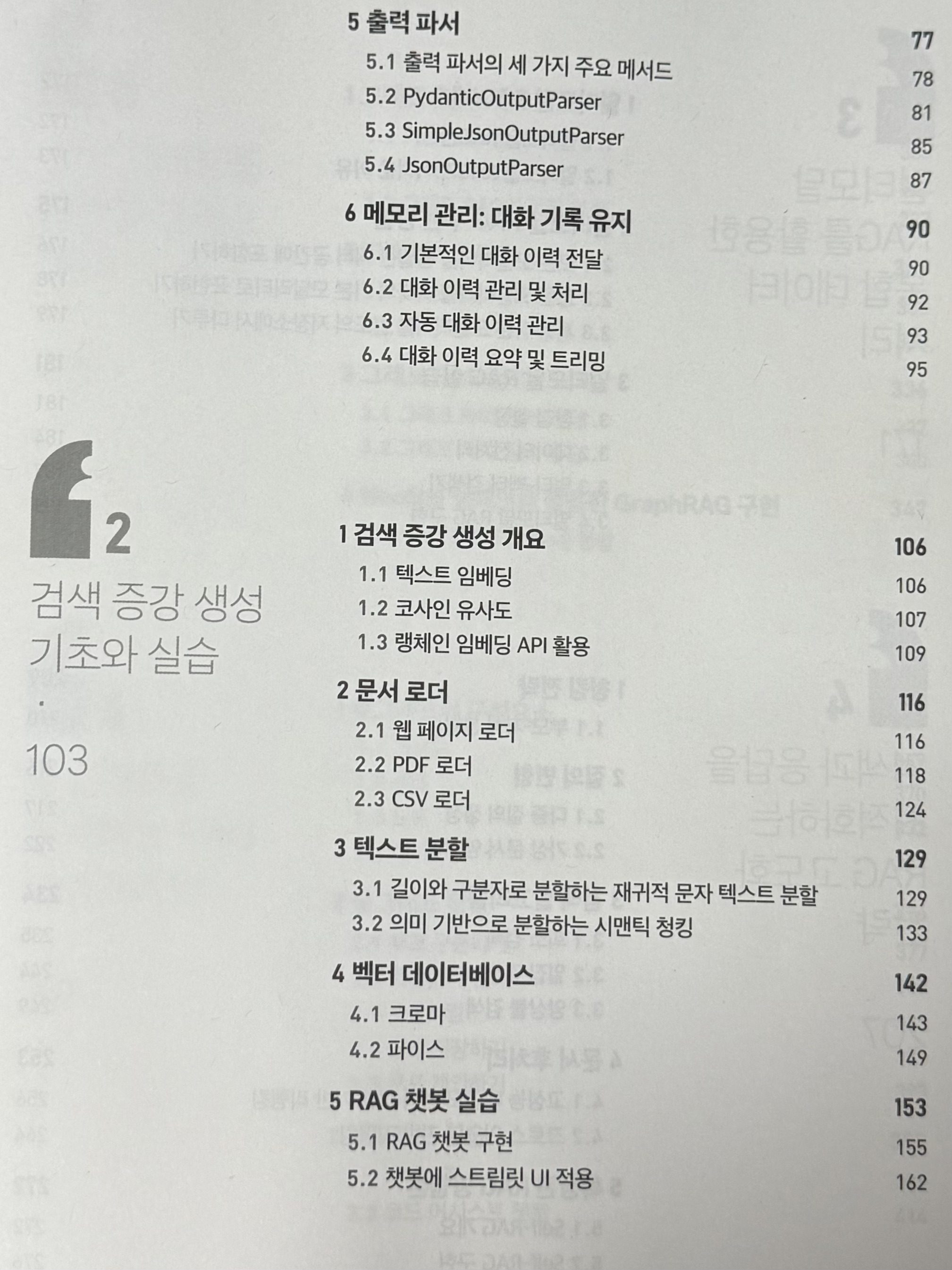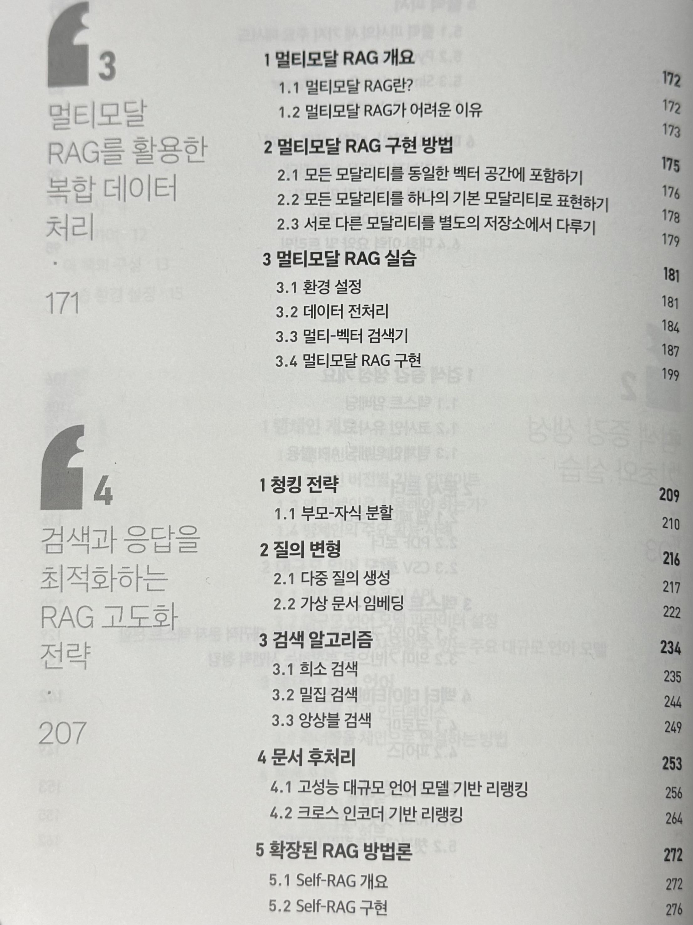책의 목차만 살펴봐도 이 책이 얼마나 폭넓고 깊이 있는 내용을 담고 있는지 단번에 알 수 있다. 랭체인의 기본 개념부터 시작해서 RAG의 기초 구조, 멀티모달 RAG, RAG 고도화 전략, 그래프 RAG, RAG 파이프라인 구성 방식, 랭그래프, 리액트 에이전트, LLM 파인튜닝, 임베딩 모델 파인튜닝 등 RAG와 관련된 거의 모든 개념과 기술을 담고 있다. 단순히 내용이 많기만 한 것이 아니라 각 주제마다 이해를 도와주는 그림, 개념 정리, 코드 실습이 함께 구성되어 있기 때문에 처음 접하는 개념도 무리 없이 따라갈 수 있고 놓치기 쉬운 세부 구현 방식이나 최적화 방법 등을 다시 한번 정리해 볼 수 있다. 특히 마음에 들었던 점은 단편적인 기능이나 개념만을 나열하는 방식이 아니라 구현 순서를 따라가며 학습할 수 있도록 구성되어 있다는 점이었다. RAG라는 기술을 처음부터 끝까지 하나의 유기적인 구조로 이해하고 실제로 구현하며 성능을 최적화하고 확장까지 이어갈 수 있는 매우 체계적이고 실용적인 안내서라고 느꼈다.