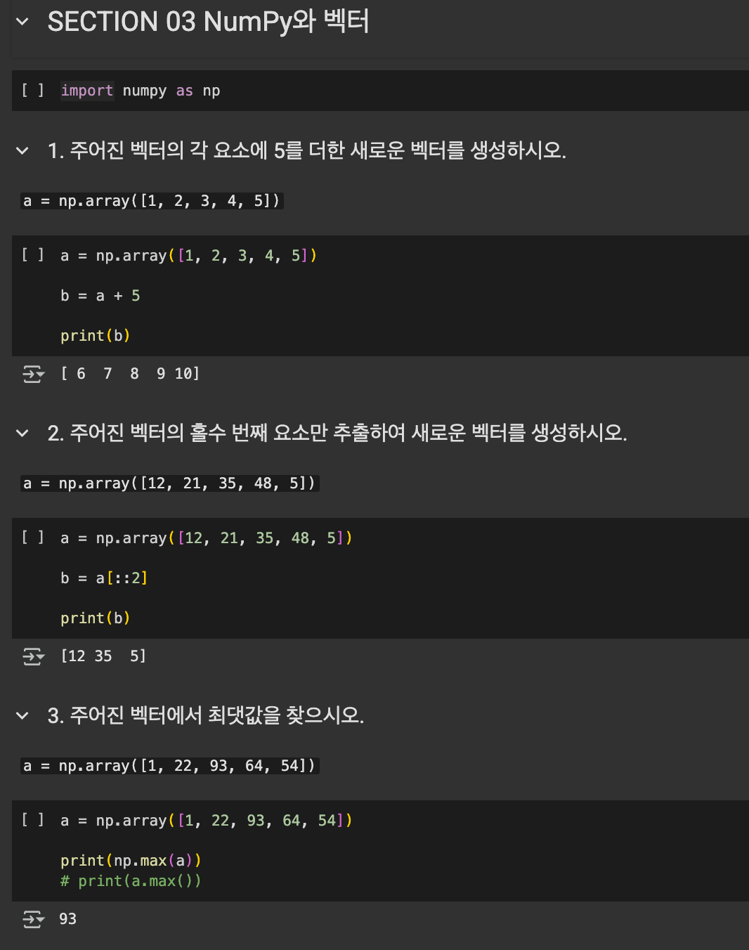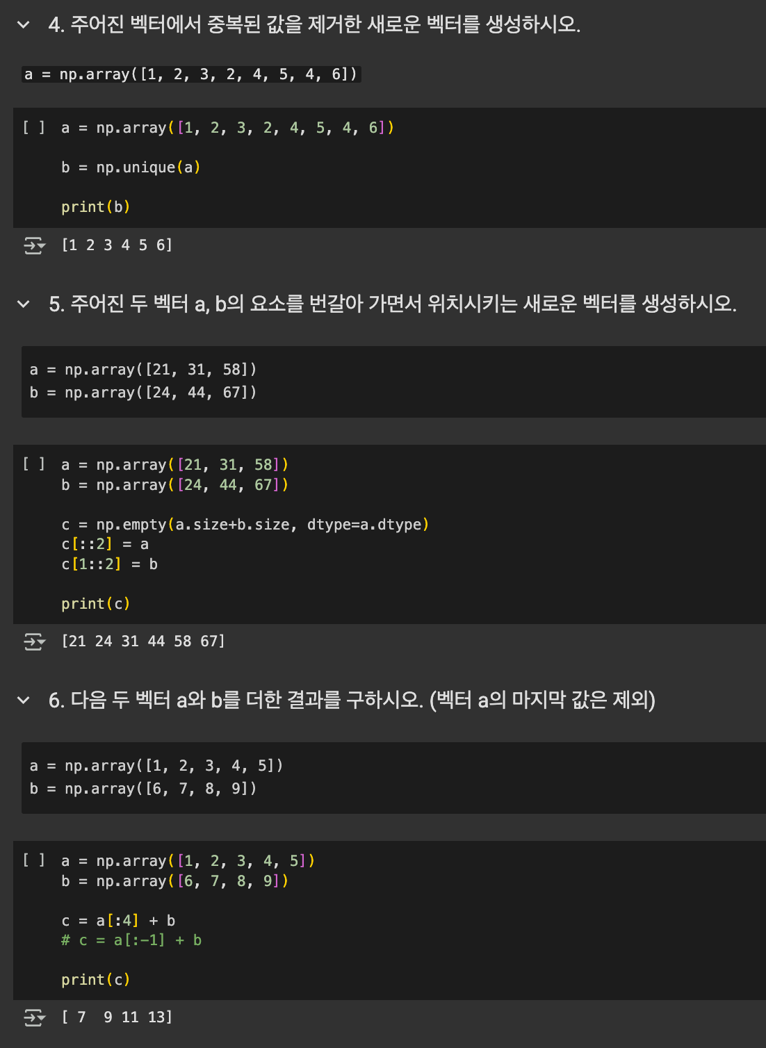 이번 주는 Python, NumPy, Pandas 등 이미 익숙한 내용을 다루는 범위였기 때문에 책을 한 번 정독한 후 연습문제를 눈으로 보지 않고 직접 푸는 방식으로 복습하며 학습을 진행했습니다.