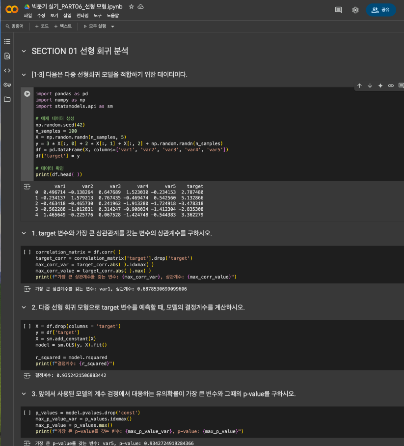 통계적 추정과 검정 파트는 개념과 용어의 양이 많고 서로 헷갈리는 부분이 많아 개인적으로 어려움을 느끼는 영역이었는데 이번 기회를 통해 핵심 개념들을 체계적으로 정리하며 제대로 공부할 수 있었던 것 같습니다. 아직은 코드 활용이 익숙하지 않은 부분도 있어 관련 함수와 검정 절차를 직접 구현해보며 복습할 필요성을 느꼈습니다. 선형 모형 파트는 이전에도 자주 접했던 내용이라 비교적 익숙했지만 이제는 설명 없이도 코드를 자연스럽게 작성할 수 있도록 반복 연습을 해두려 합니다.