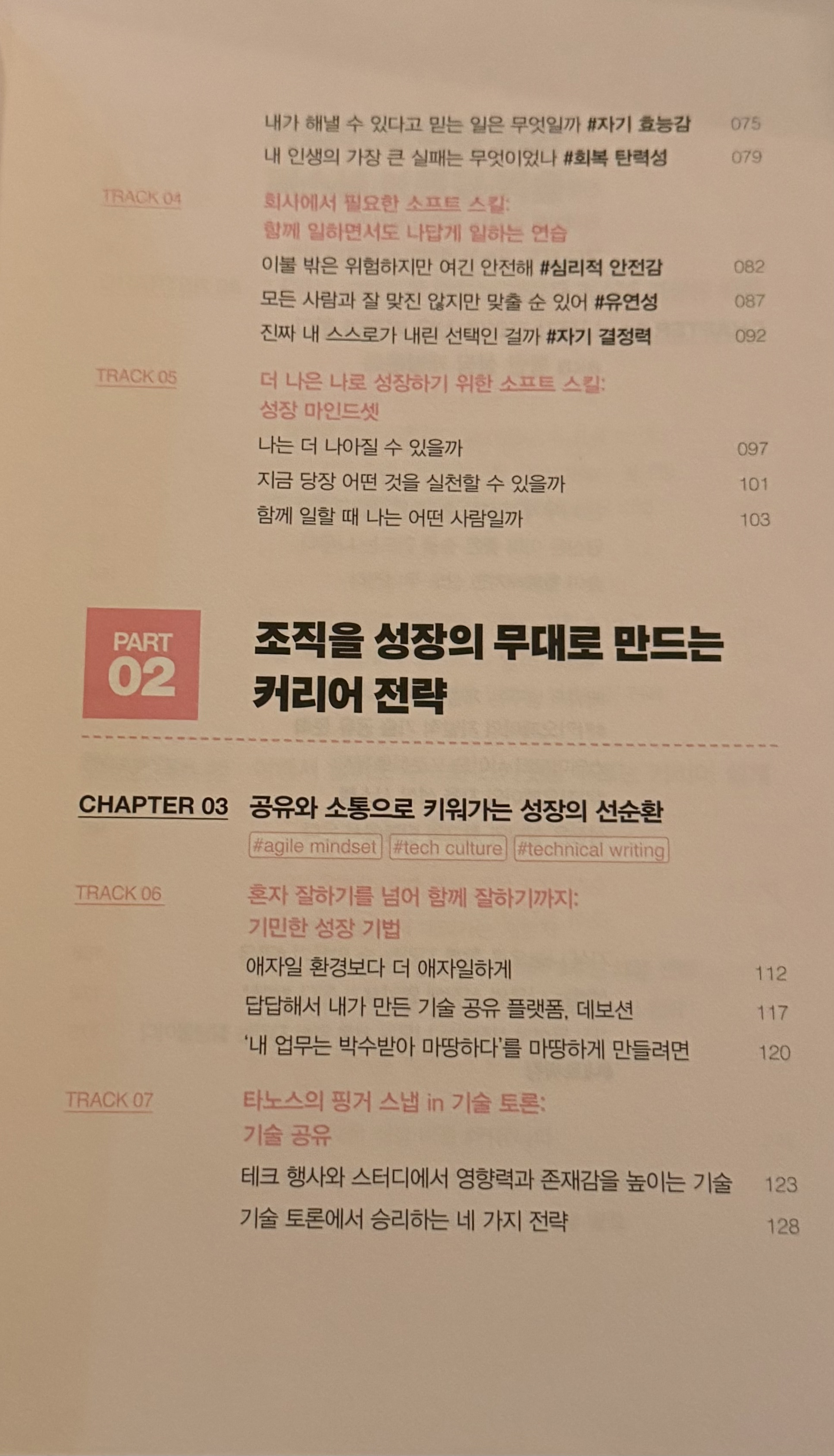 이 책은 본격적인 내용에 들어가기 전에 ‘이렇게 읽어보세요’라는 파트를 마련하고 있다. 이 부분에서는 독자의 상황과 목표에 따라 맞춤형 읽기 순서를 제안한다. 취업이나 이직을 준비하는 사람, 주니어에서 시니어로 성장하는 과정에 있는 사람, 이미 시니어 개발자인 사람 등 세 가지 경우로 나누어 읽는 방식을 안내한다. 어떤 단계에 있는 개발자라도 유의미한 도움을 얻을 수 있다는 자신감이 드러나며, 특히 바쁜 현대 사회에서 독자가 필요한 부분만 집중적으로 읽을 수 있도록 읽기 순서를 제안한 점이 매우 인상 깊었다.
