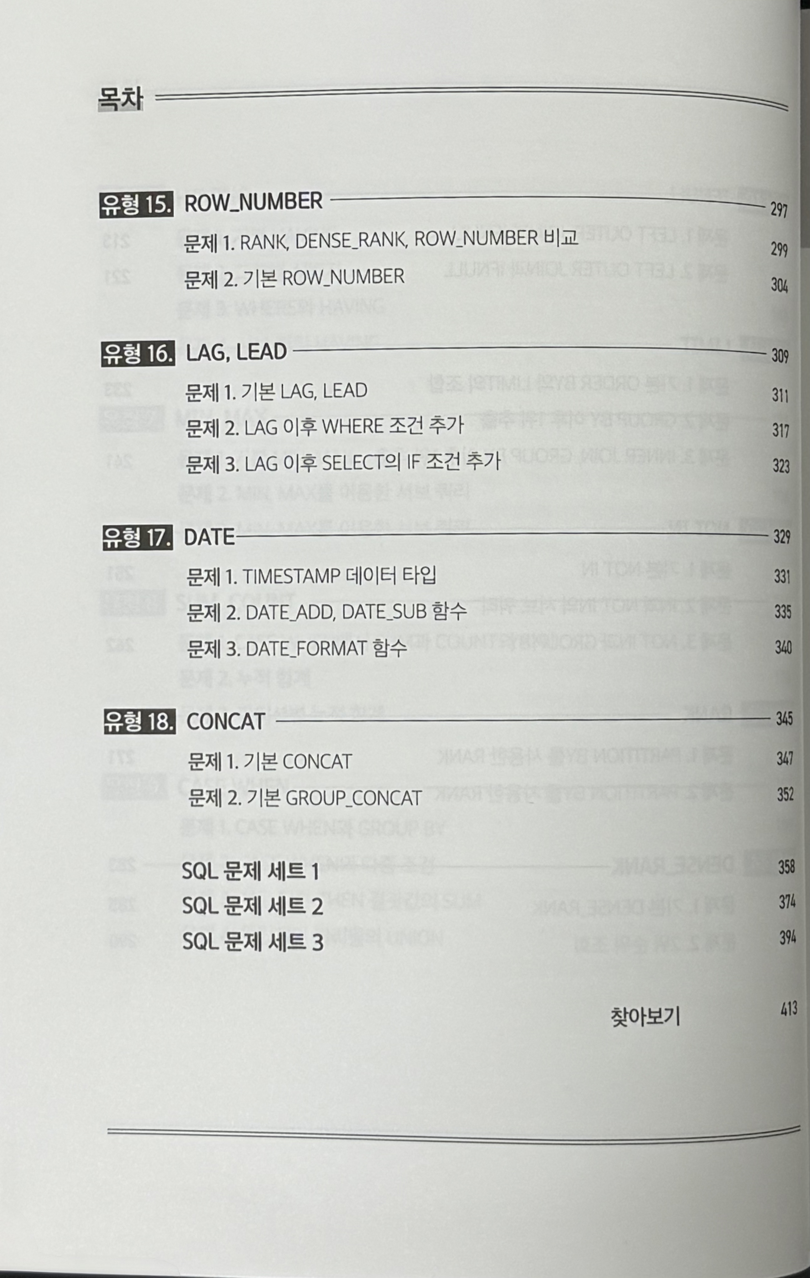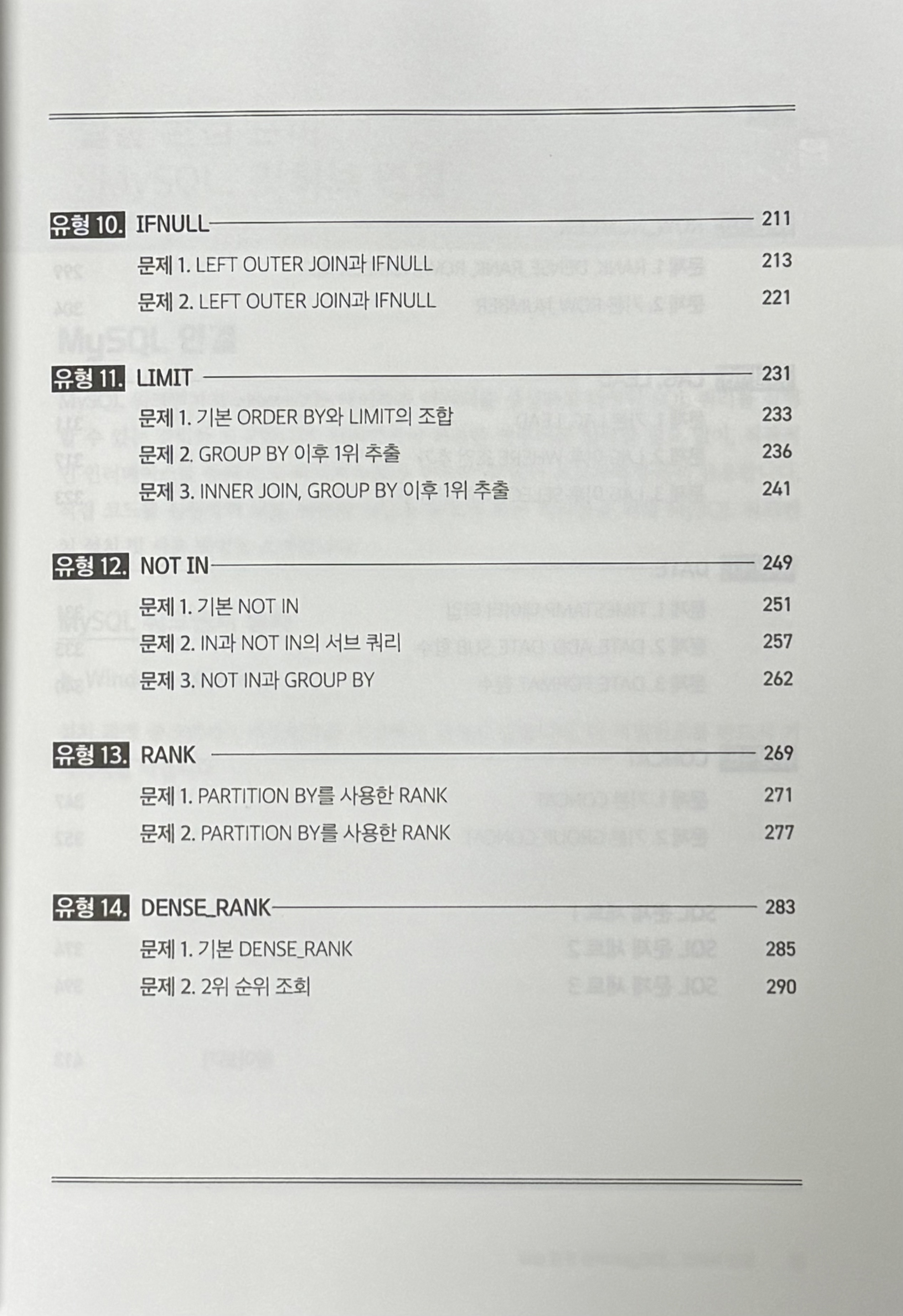 이 책은 SQL 문법을 총 18개의 유형으로 나누고 각 유형에 대해 단계적으로 설명한다. 설명은 그림과 도표를 활용하여 개념을 시각적으로 이해할 수 있도록 구성되어 있다. 테이블 구조를 직접 보여주면서 쿼리가 실행되는 과정을 설명해 준다. 또한 각 문법의 기본적인 구조에서부터 확장된 활용까지 예제를 통해 꼼꼼하게 다루어 주기 때문에 문법을 이해하고 다양한 상황에서 응용할 수 있게 한다. 또한 각 유형 파트에서 해당 유형을 활용하는 예제 문제를 난이도 별로 제공하며 풀이 과정을 길게 설명해 준 점이 인상 깊었다. 이러한 구성 덕분에 단순 암기식 학습이 아니라 개념을 체계적으로 이해하고, 실제로 활용할 수 있는 힘을 기를 수 있었다고 느꼈다.