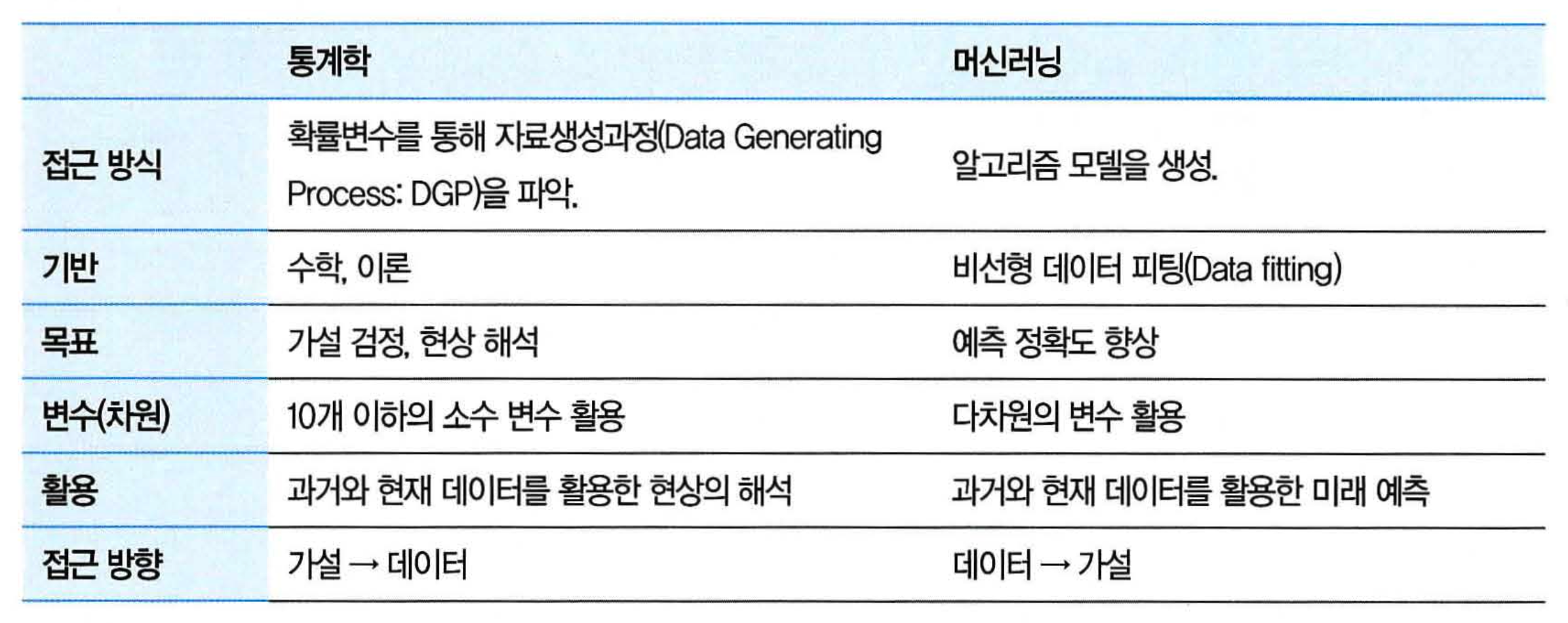 통계학과 머신러닝의 차이를 표로 요약하면 표 1.1과 같다.