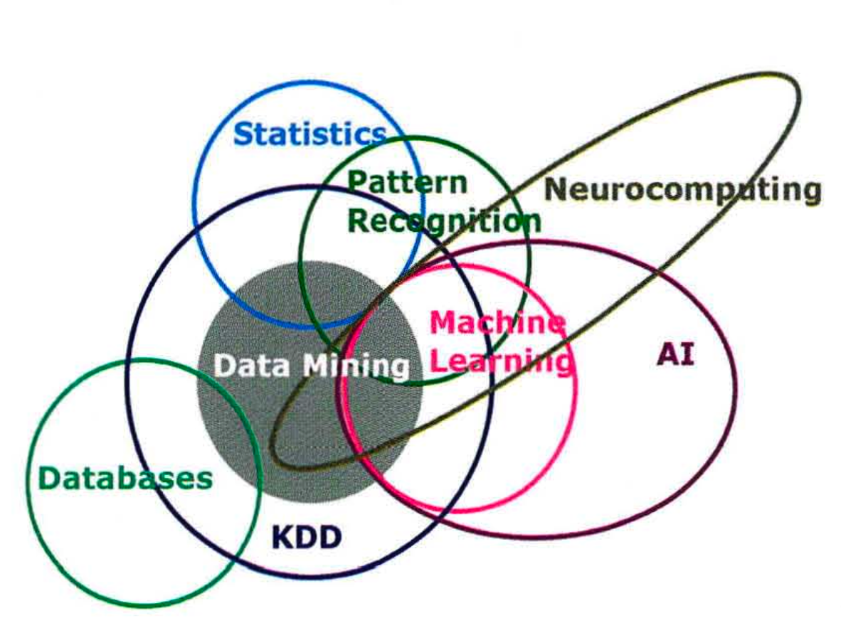 데이터 과학의 분야는 통계학, 머신러닝, AI 등의 영역이 미묘하게 뒤섞여 있다. 전통적 통계학과 머신러닝 교집합의 관계를 가지고 있다. 머신러닝은 통계학의 일부 특성을 활용한 응용과학 분야이다. 그림 1.1 은 SAS institute에서 정의한 데이터 과학 분야의 영역 다이어그램이다.