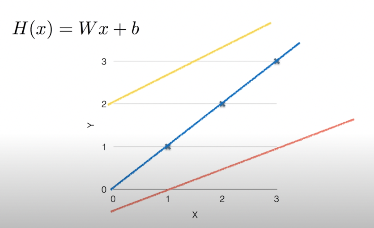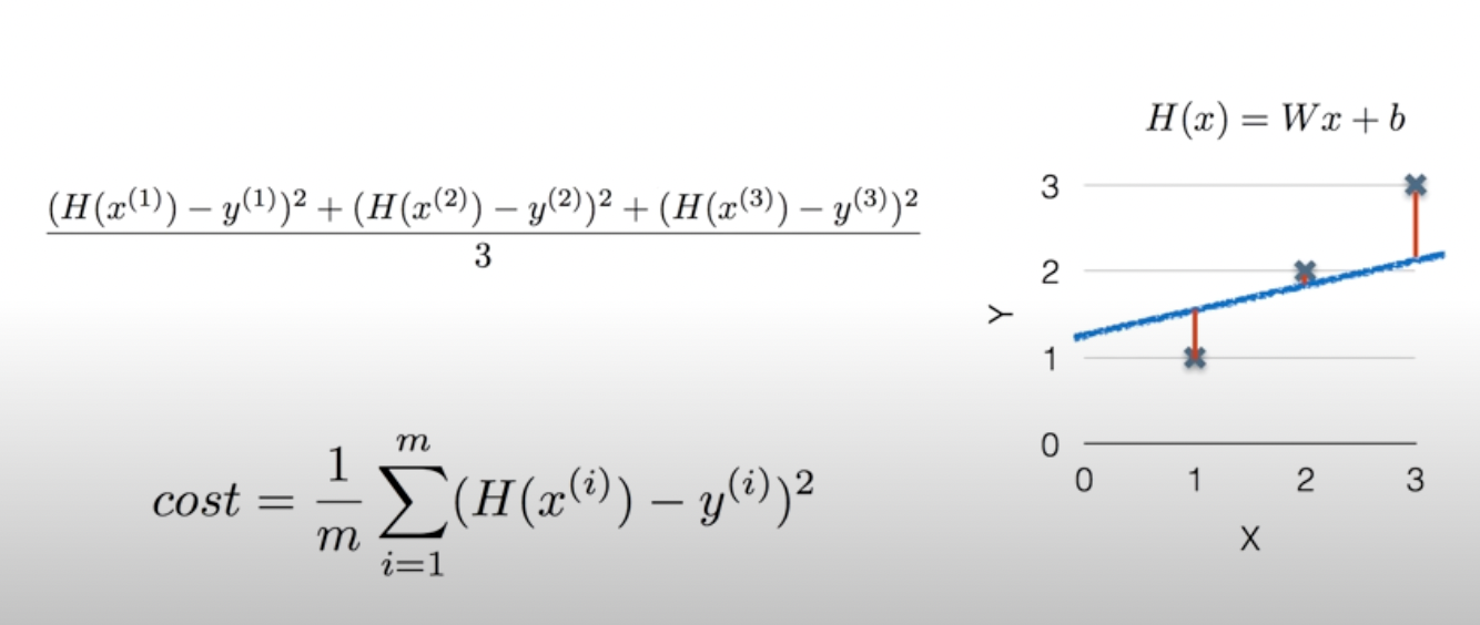 위의 그림에 있는 수식에서 H(x)는 가설이며 이렇게 x에 W를 곱한 후 b를 더해서 얻는 일차방정식의 형태의 가설을 세우는 것이 Linear Regression의 첫 단계이다. W는 Weight, b는 bias이며, W와 b의 값에 따라 선의 모양이 달라질 것이다. 그렇다면 어떤 가설이 더 좋은지는 어떻게 확인할까? 이는 실제 데이터와 가설을 나타내는 선의 거리 차이로 계산할 수 있다.