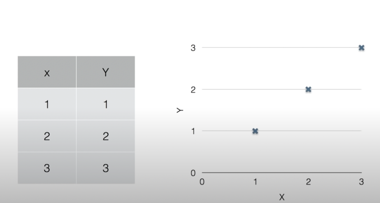 간단한 데이터를 왼쪽에 준비했다. 여기서 x는 feature라고도 하는 예측하기 위한 기본적인 자료, y는 예측해야 할 대상이다. 이 데이터를 간단하게 그래프에 그려보면 오른쪽 그림과 같다.
