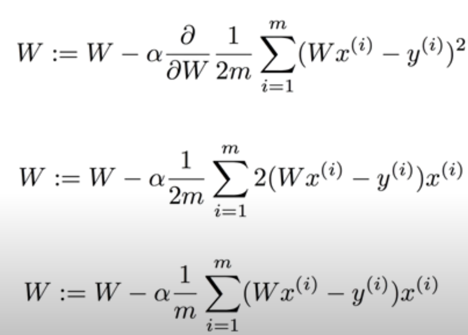 경사도는 미분을 이용하여 계산할 수 있다. 미분을 쉽게 하기 위해서 Cost Function의 분모에 2를 곱해주었다. 그다음, Weight를 구할 때 learning rate(α: 알파)에 Cost(W) 값을 미분한 값을 곱한 결과를 현재 Weight의 값에서 빼준다.