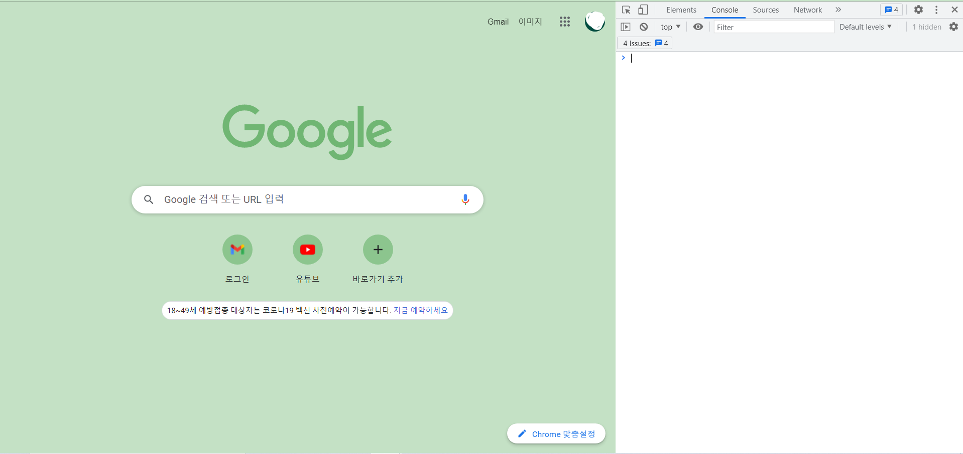 chrome에서 f12를 누르거나 우 클릭을 하여 검사 탭을 클릭하고 우측 창에서 Console을 클릭하면 console 창이 뜬다.