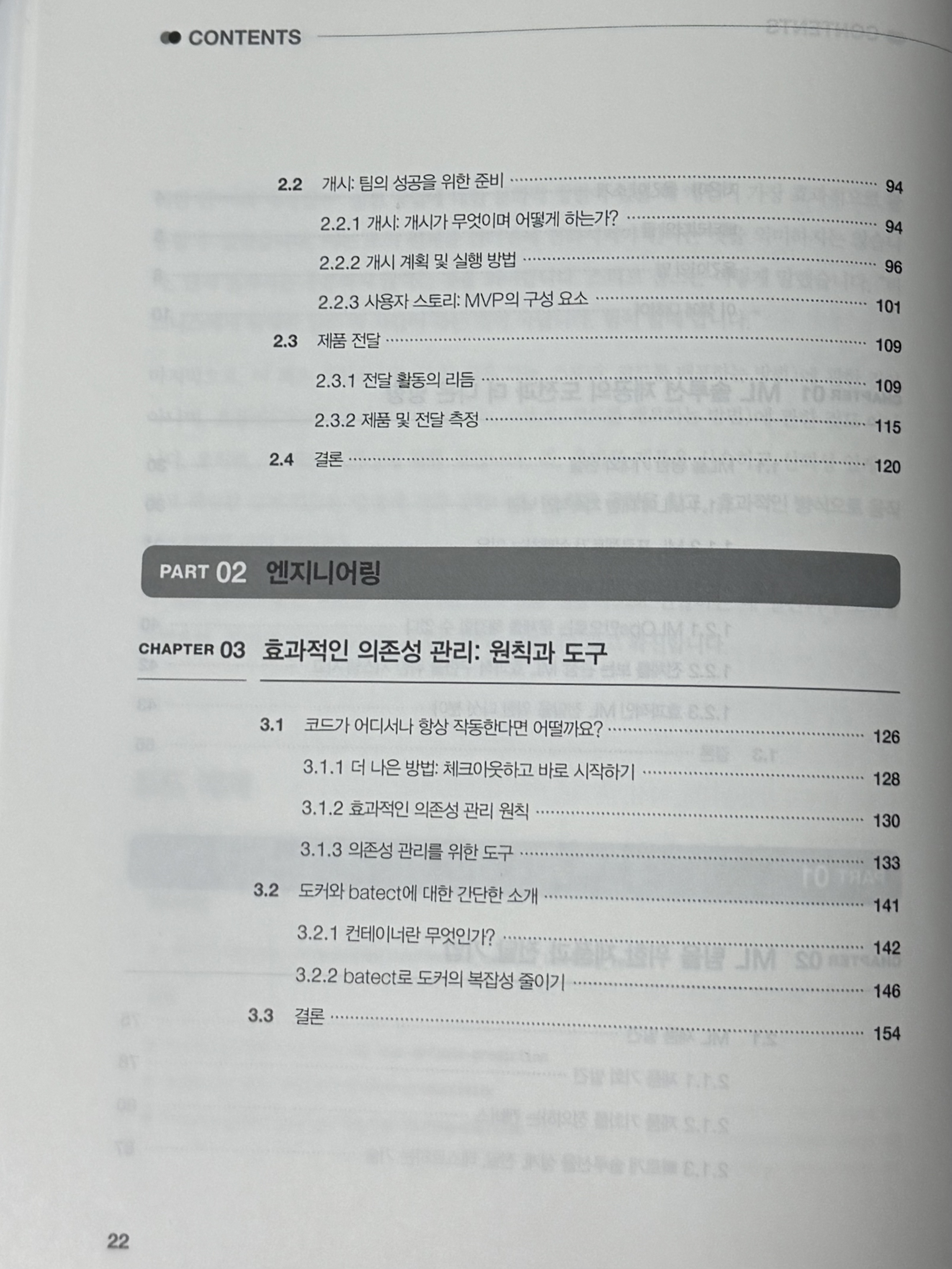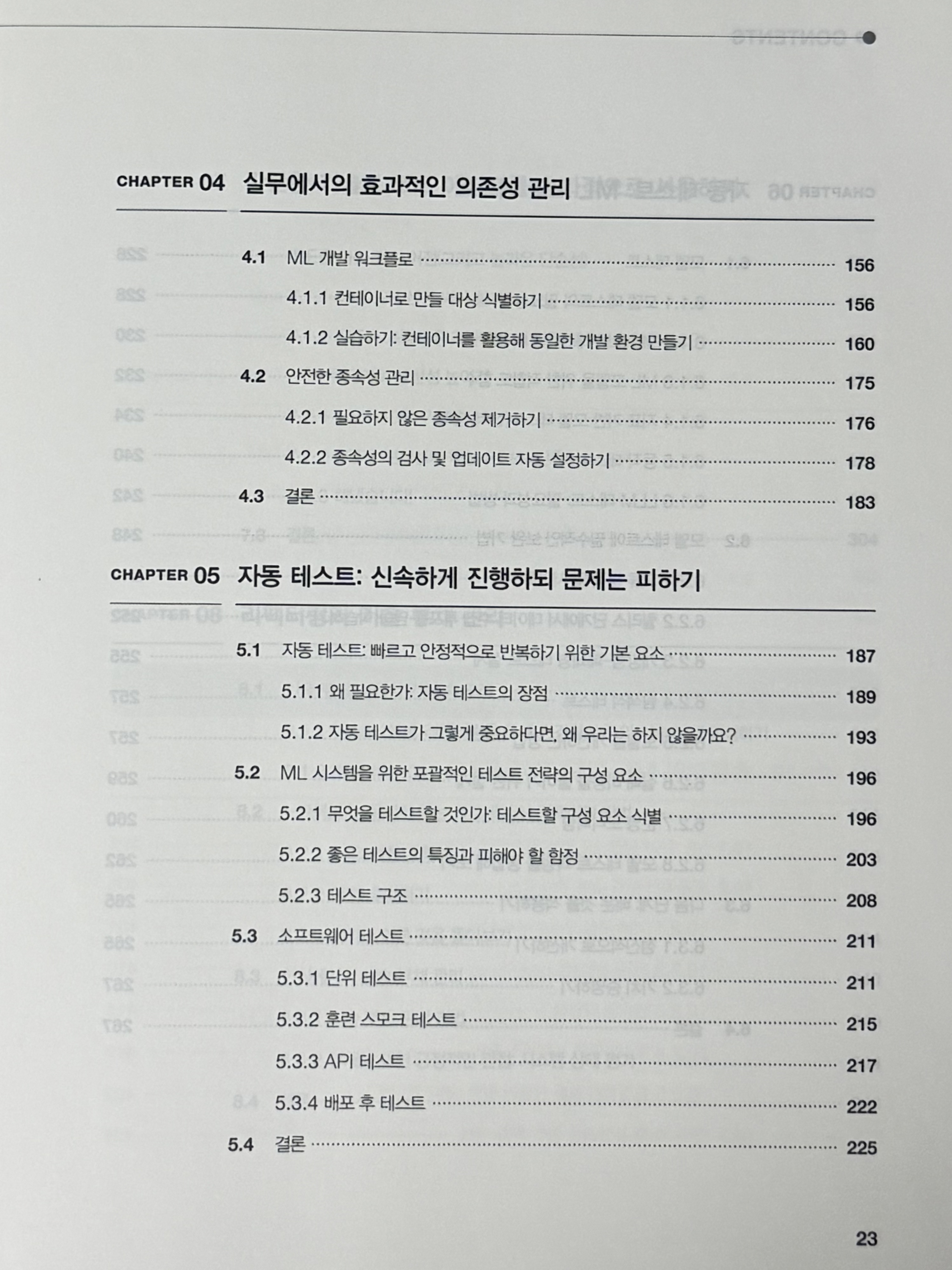 머신러닝을 단순한 모델링 문제가 아니라, 복잡한 소프트웨어 개발 과정의 일부로 다룬다. 개발자라면 익숙한 의존성 관리, 테스트 자동화, 코드 품질 관리 등의 개념을 ML 프로젝트에 맞게 재해석하여 설명하고 있으며 각 기술의 적용 방법과 필요성도 구체적으로 서술한다. 예를 들어, 모델 테스트는 단순히 성능 수치만을 보는 것이 아니라 모델의 신뢰성과 유지보수 가능성을 확보하기 위한 테스트 전략이 필요함을 강조한다. 이러한 접근은 머신러닝을 단발성 실험이 아닌 지속 가능한 시스템으로 바라보게 만든다.