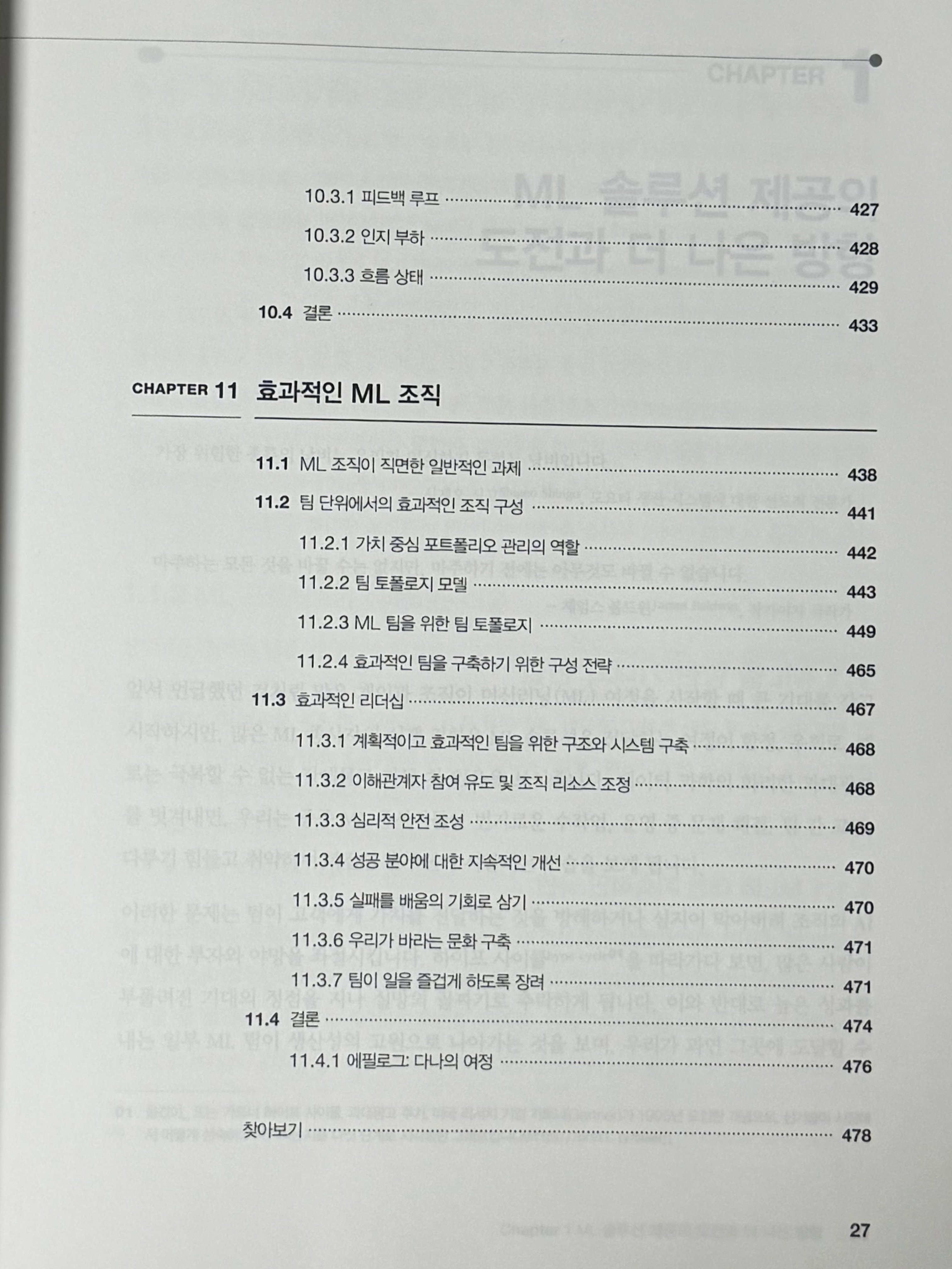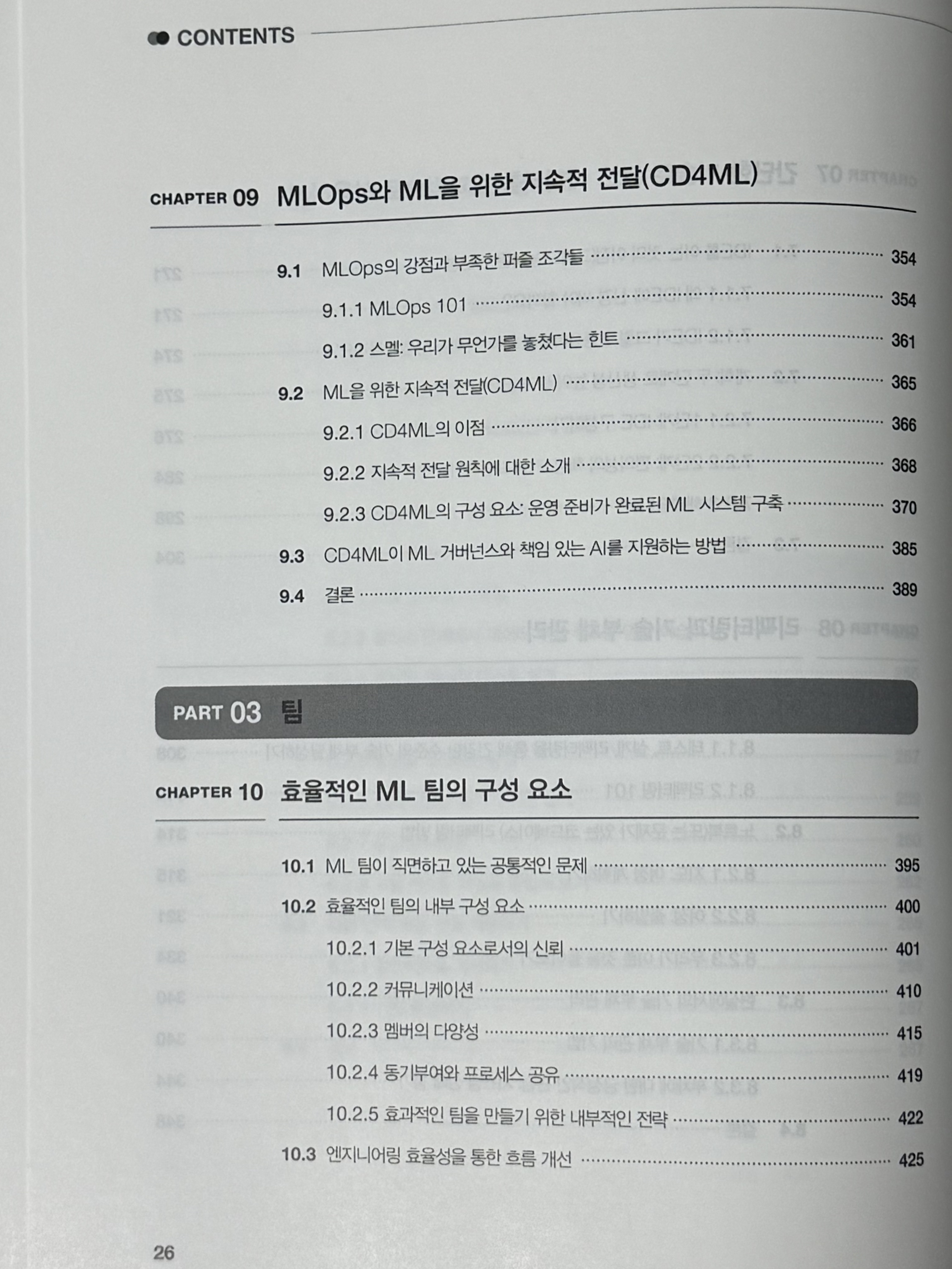 이 책은 단순히 머신러닝 모델을 설계하고 학습하는 기술에 머무르지 않는다. 모델이 어떻게 실제 제품에 녹아들고 사용자에게 도달하며 안정적으로 운영되는지를 전체적인 흐름 속에서 설명하는 점이 인상 깊다. 특히 초반에는 ML 프로젝트의 전달 방식이나 제품화 전략을 다루고, 후반부에서는 CD4ML이나 MLOps와 같이 운영 환경에 적합한 형태로 ML 시스템을 발전시키는 과정에 집중한다. 모델 개발 이후의 과정에서 막막함을 느꼈던 사람이라면 이 책을 통해 머신러닝을 실질적으로 활용하는 데 필요한 큰 그림을 얻을 수 있다.